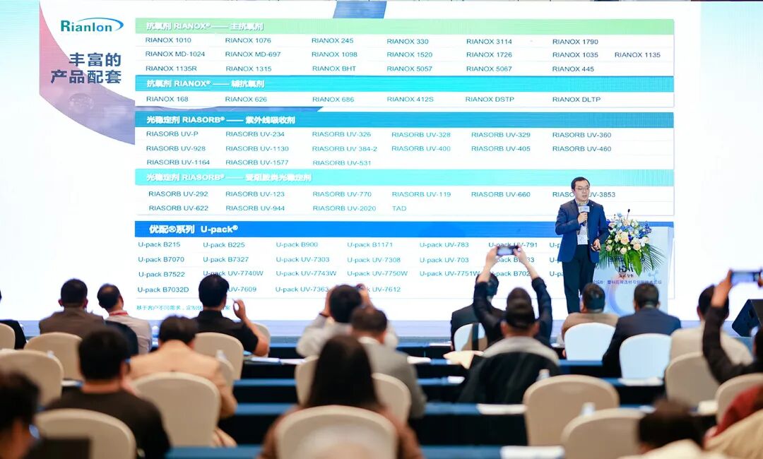 围绕材料应用不断升级的需求,罗海总监在大会上带来《从防护到赋能:利安隆高性能抗老化方案,助力改性产品升级》的专题分享。利安隆一系列前沿抗氧剂、光稳定剂产品和创新抗老化方案,正从传统的“延长材料寿命”向“性能提升器”转型,在塑料加工稳定性、外观保持及长期可靠性等维度,持续创造附加价值,成为高性能材料体系中的关键支点。