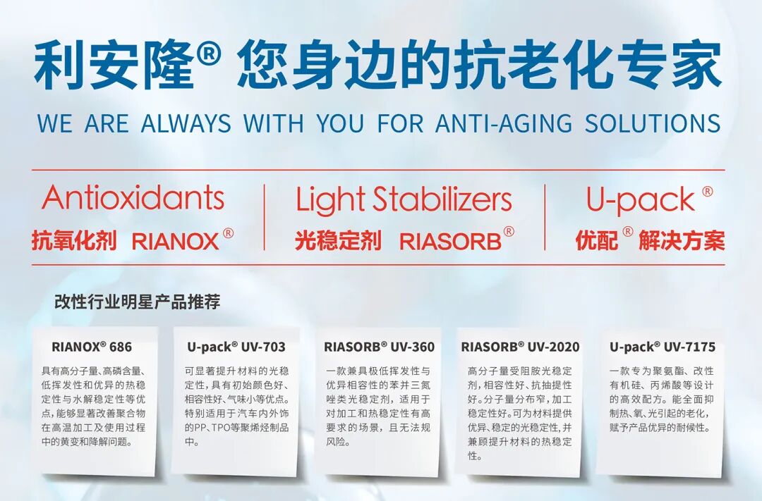 依托【创新选材】等高质量平台,利安隆将持续深化塑料改性产业链协同,以技术创新为核心,推动材料抗老化解决方案向更高性能与更广应用领域延展,为新能源汽车、消费电子及可持续材料发展提供长期支撑。