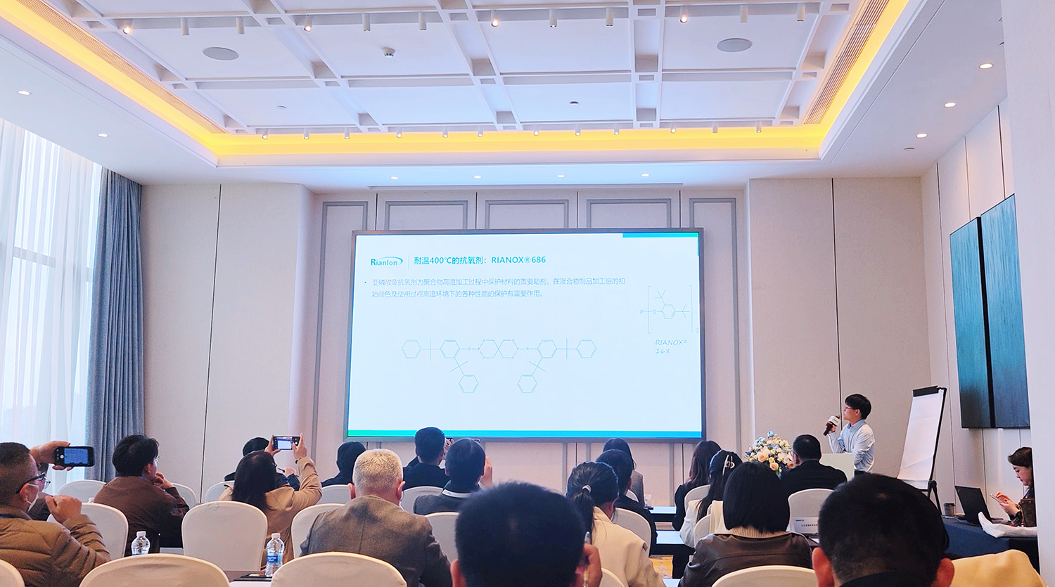 在本次大会的新品推介环节,利安隆重点展示了耐温400度的抗氧剂:RIANOX®686。这款高性能亚磷酸酯类抗氧剂,具有高分子量、高磷含量、低挥发性和优异的热稳定性与水解稳定性等优点,可显著抑制材料在高温加工及长期使用过程中的黄变与降解,助力高端工程塑料在严苛环境下实现更持久的性能表现。